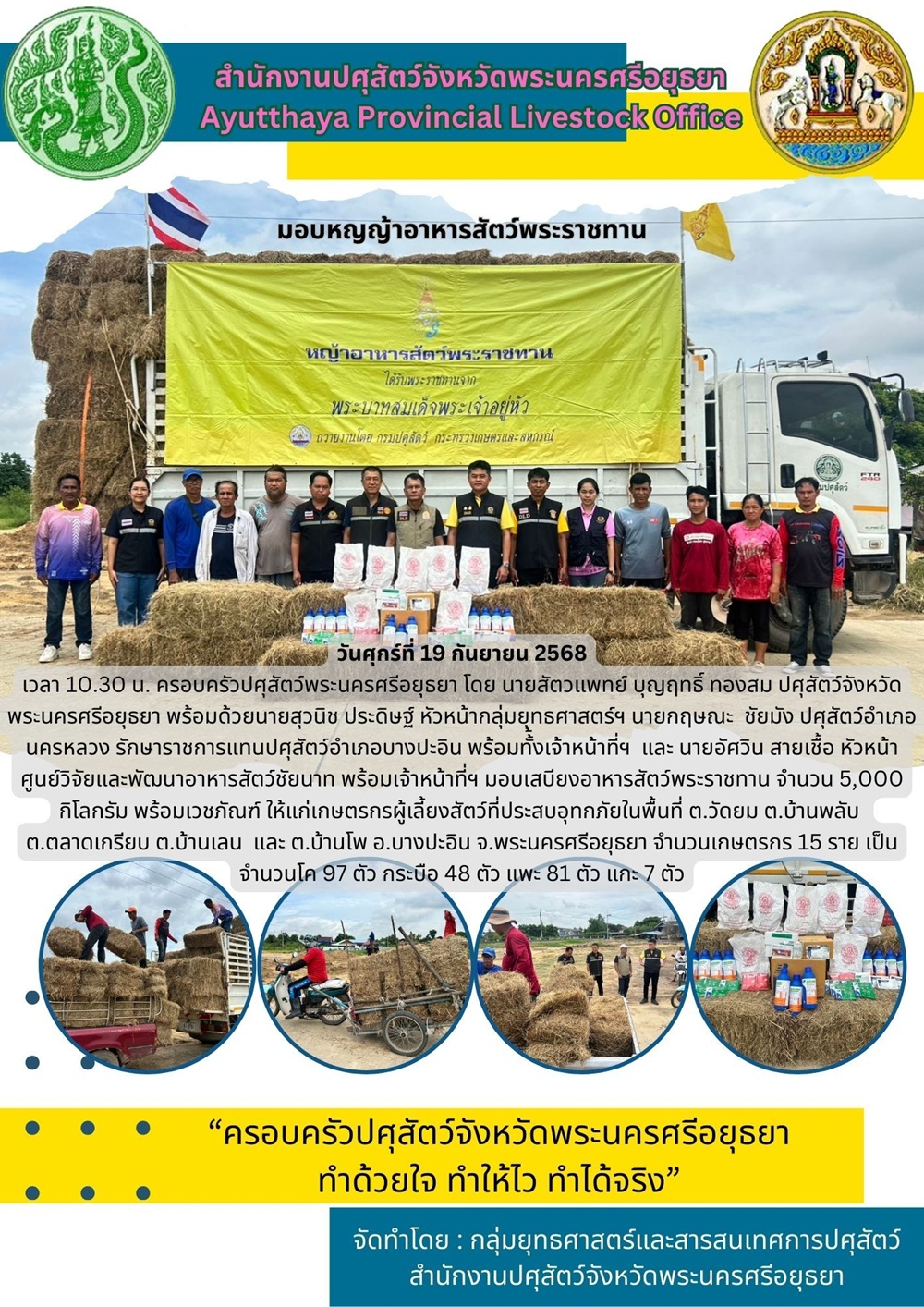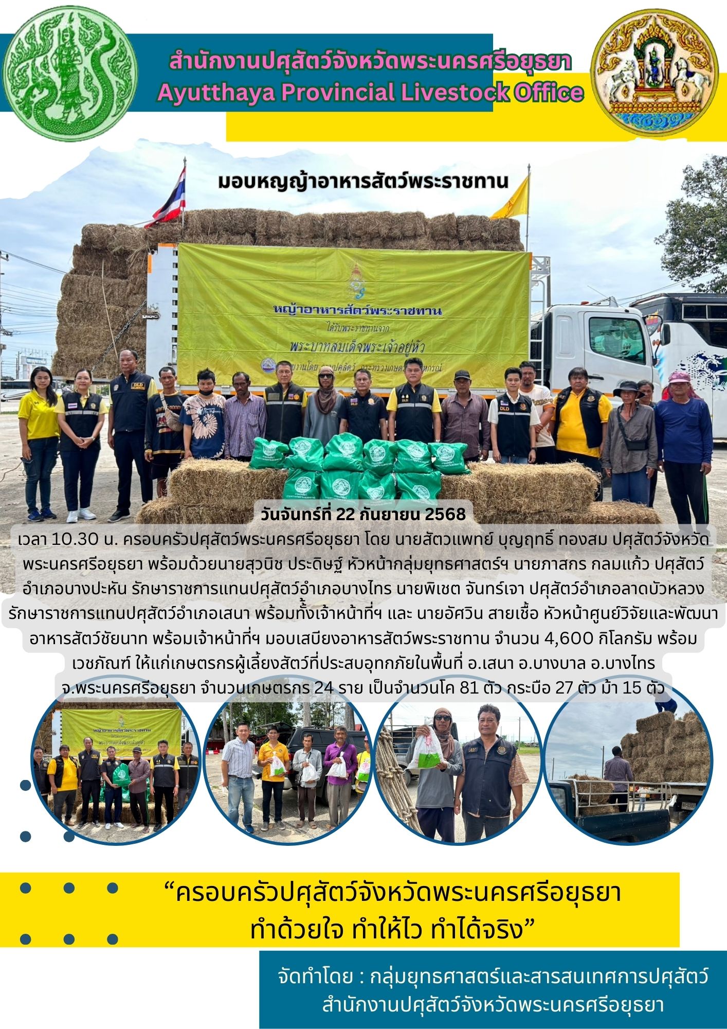 เวลา 10.30 น. ครอบครัวปศุสัตว์พระนครศรีอยุธยา โดย นายสัตวแพทย์ บุญฤทธิ์ ทองสม ปศุสัตว์จังหวัดพระนครศรีอยุธยา พร้อมด้วยนายสุวนิช ประดิษฐ์ หัวหน้ากลุ่มยุทธศาสตร์ฯ นายภาสกร กลมแก้ว ปศุสัตว์อำเภอบางปะหัน รักษาราชการแทนปศุสัตว์อำเภอบางไทร นายพิเชต จันทร์เจา ปศุสัตว์อําเภอลาดบัวหลวง รักษาราชการแทนปศุสัตว์อําเภอเสนา พร้อมทั้้งเจ้าหน้าที่ฯ และ นายอัศวิน สายเชื้อ หัวหน้าศูนย์วิจัยและพัฒนาอาหารสัตว์ชัยนาท พร้อมเจ้าหน้าที่ฯ มอบเสบียงอาหารสัตว์พระราชทาน จำนวน 4,600 กิโลกรัม พร้อมเวชภัณฑ์ ให้แก่เกษตรกรผู้เลี้ยงสัตว์ที่ประสบอุทกภัยในพื้นที่ อ.เสนา อ.บางบาล อ.บางไทร จ.พระนครศรีอยุธยา จำนวนเกษตรกร 24 ราย เป็นจำนวนโค 81 ตัว กระบือ 27 ตัว ม้า 15 ตัว