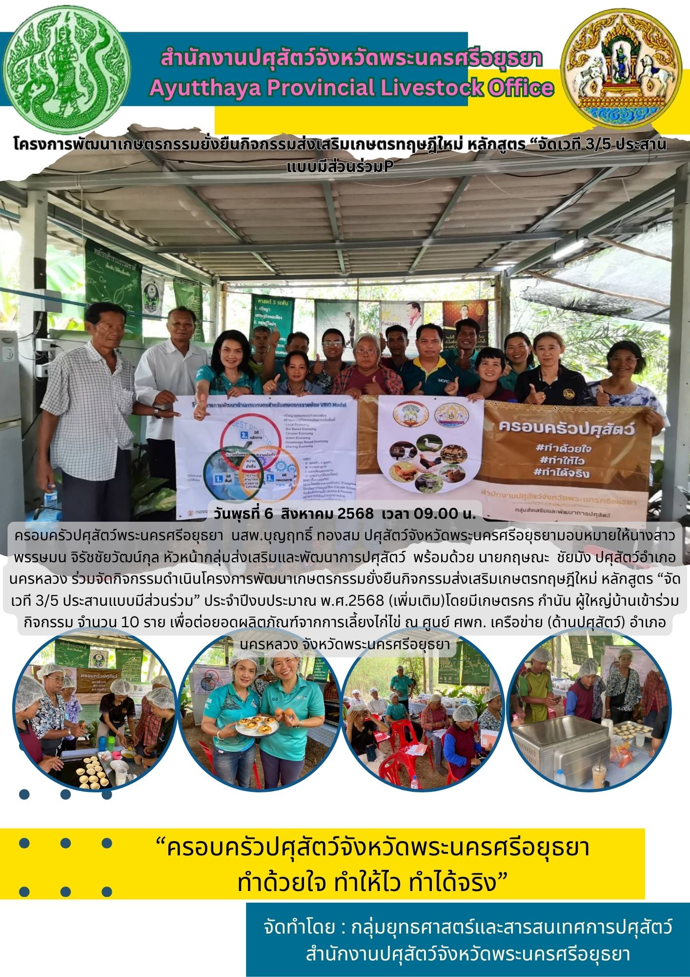 ครอบครัวปศุสัตว์พระนครศรีอยุธยา นสพ.บุญฤทธิ์ ทองสม ปศุสัตว์จังหวัดพระนครศรีอยุธยามอบหมายให้นางสาวพรรษมน จิรัชชัยวัฒน์กุล หัวหน้ากลุ่มส่งเสริมและพัฒนาการปศุสัตว์ พร้อมด้วย นายกฤษณะ ชัยมัง ปศุสัตว์อำเภอนครหลวง ร่วมจัดกิจกรรมดำเนินโครงการพัฒนาเกษตรกรรมยั่งยืนกิจกรรมส่งเสริมเกษตรทฤษฎีใหม่ หลักสูตร “จัดเวที 3/5 ประสานแบบมีส่วนร่วม” ประจำปีงบประมาณ พ.ศ.2568 (เพิ่มเติม)โดยมีเกษตรกร กำนัน ผู้ใหญ่บ้านเข้าร่วมกิจกรรม จำนวน 10 ราย เพื่อต่อยอดผลิตภัณฑ์จากการเลี้ยงไก่ไข่ ณ ศูนย์ ศพก. เครือข่าย (ด้านปศุสัตว์) อำเภอนครหลวง จังหวัดพระนครศรีอยุธยา