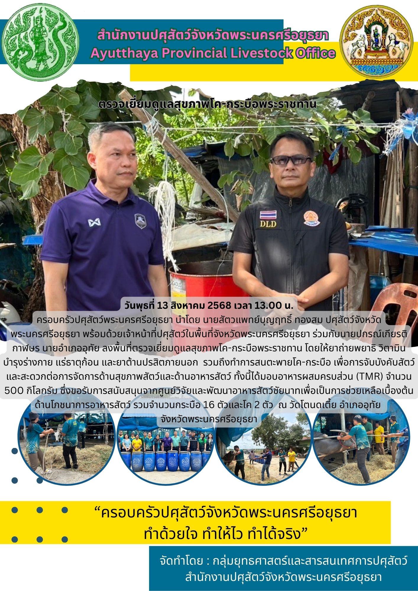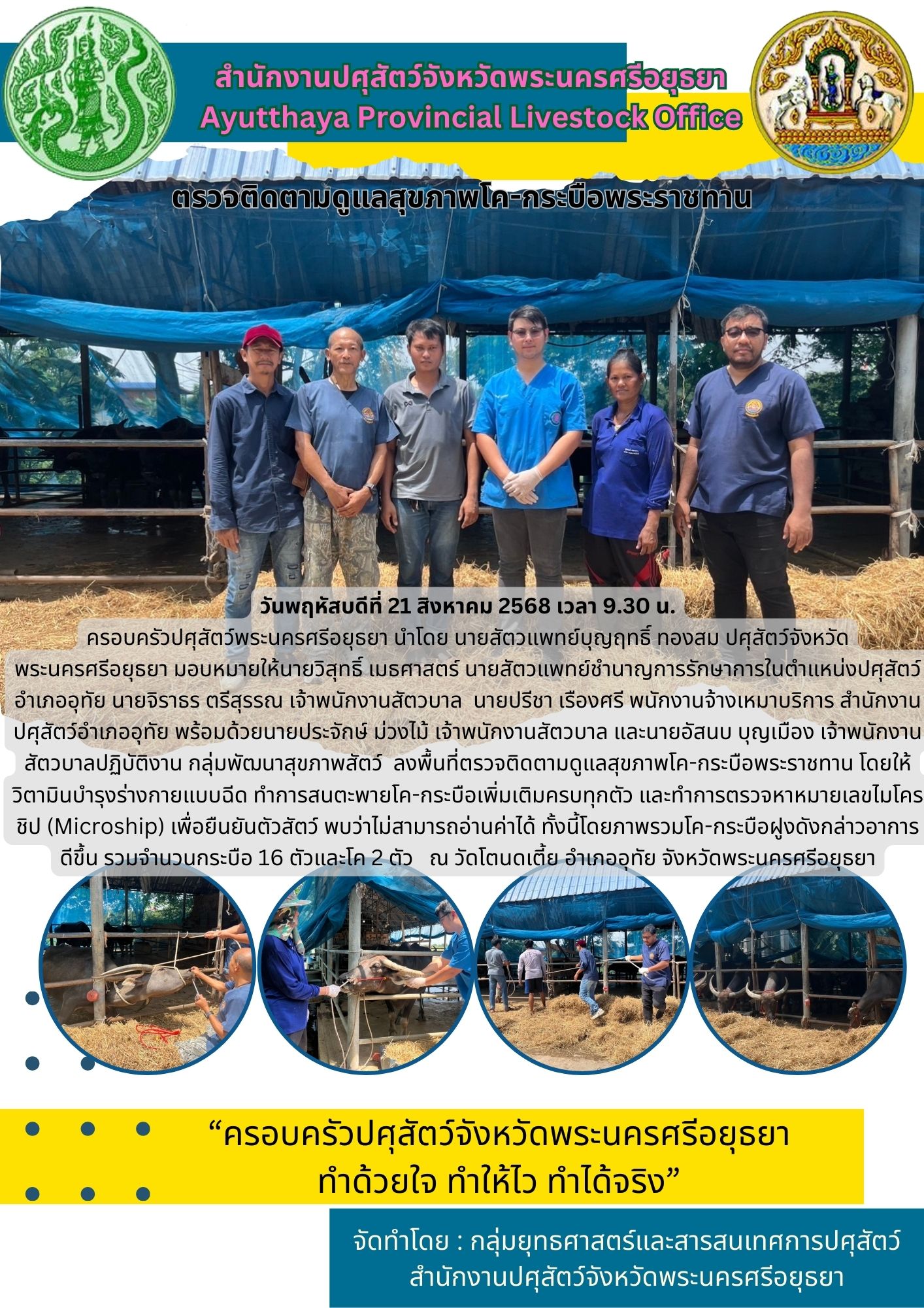 ครอบครัว​ปศุสัตว์​พระนครศรีอยุธยา นำโดย นายสัตวแพทย์บุญฤทธิ์ ทองสม ปศุสัตว์จังหวัดพระนครศรีอยุธยา มอบหมายให้นายวิสุทธิ์ เมธศาสตร์ นายสัตวแพทย์ชำนาญการรักษาการในตำแหน่งปศุสัตว์อำเภออุทัย นายจิราธร ตรีสุรรณ เจ้าพนักงานสัตวบาล นายปรีชา เรืองศรี พนักงานจ้างเหมาบริการ สำนักงานปศุสัตว์อำเภออุทัย พร้อมด้วยนายประจักษ์ ม่วงไม้ เจ้าพนักงานสัตวบาล และนายอัสนบ บุญเมือง เจ้าพนักงานสัตวบาลปฏิบัติงาน กลุ่มพัฒนาสุขภาพสัตว์ ลงพื้นที่ตรวจติดตามดูแลสุขภาพโค-กระบือพระราชทาน โดยให้วิตามินบำรุงร่างกายแบบฉีด ทำการสนตะพายโค-กระบือเพิ่มเติมครบทุกตัว และทำการตรวจหาหมายเลขไมโครชิป (Microship) เพื่อยืนยันตัวสัตว์ พบว่าไม่สามารถอ่านค่าได้ ทั้งนี้โดยภาพรวมโค-กระบือฝูงดังกล่าวอาการดีขึ้น รวมจำนวนกระบือ 16 ตัวและโค 2 ตัว ณ วัดโตนดเตี้ย อำเภออุทัย จังหวัดพระนครศรีอยุธยา